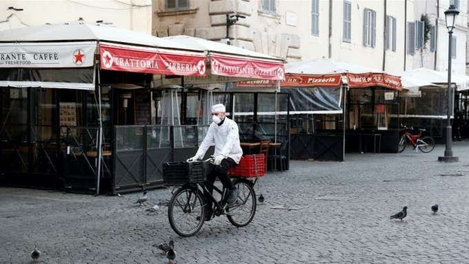 Nhân viên giao hàng đi qua một con phố vắng vẻ ở Rome (Italy). Ảnh: Reuters